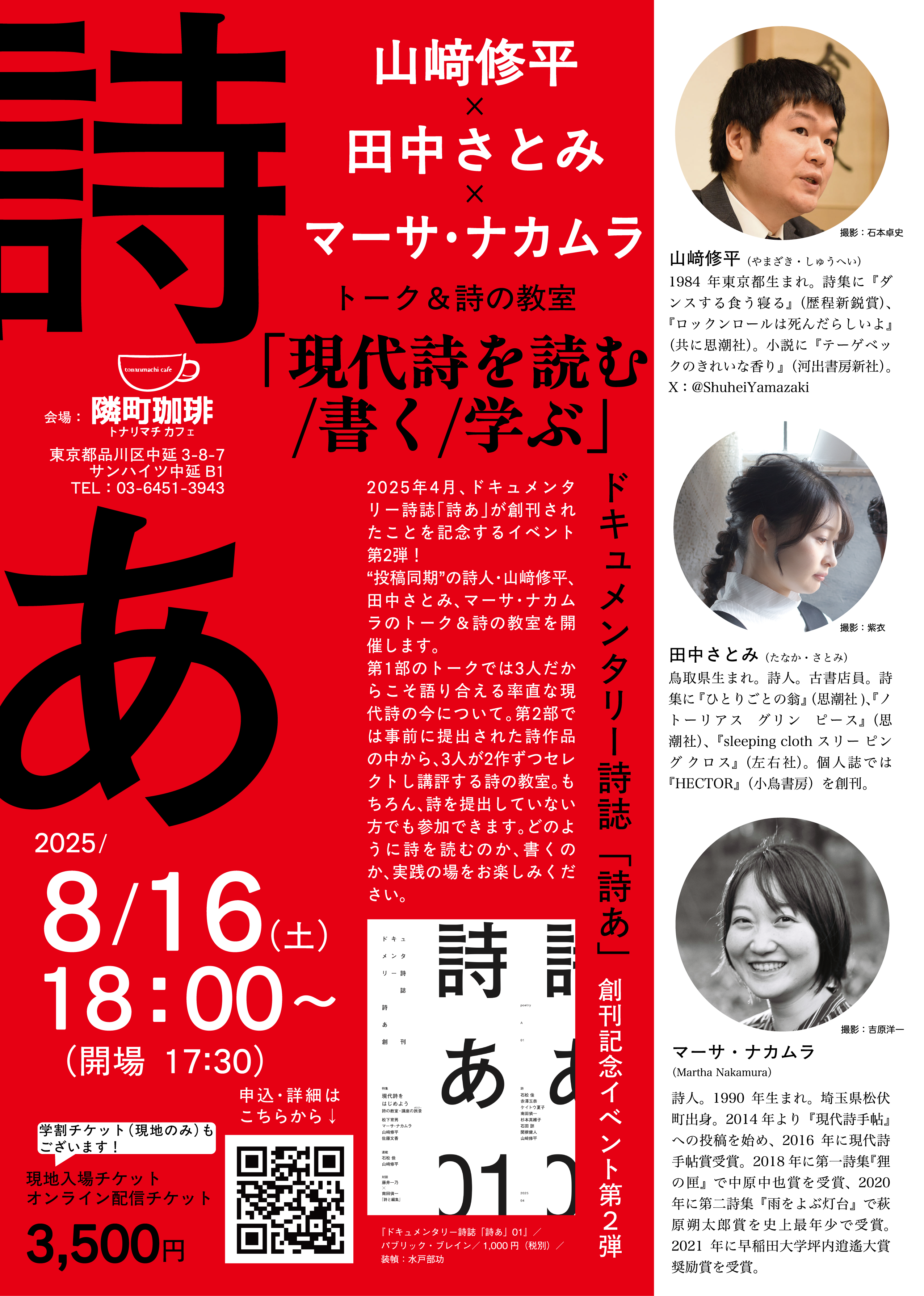ドキュメンタリー詩誌「詩あ」創刊記念イベント 山﨑修平×田中さとみ×マーサ・ナカムラ(隣町珈琲)