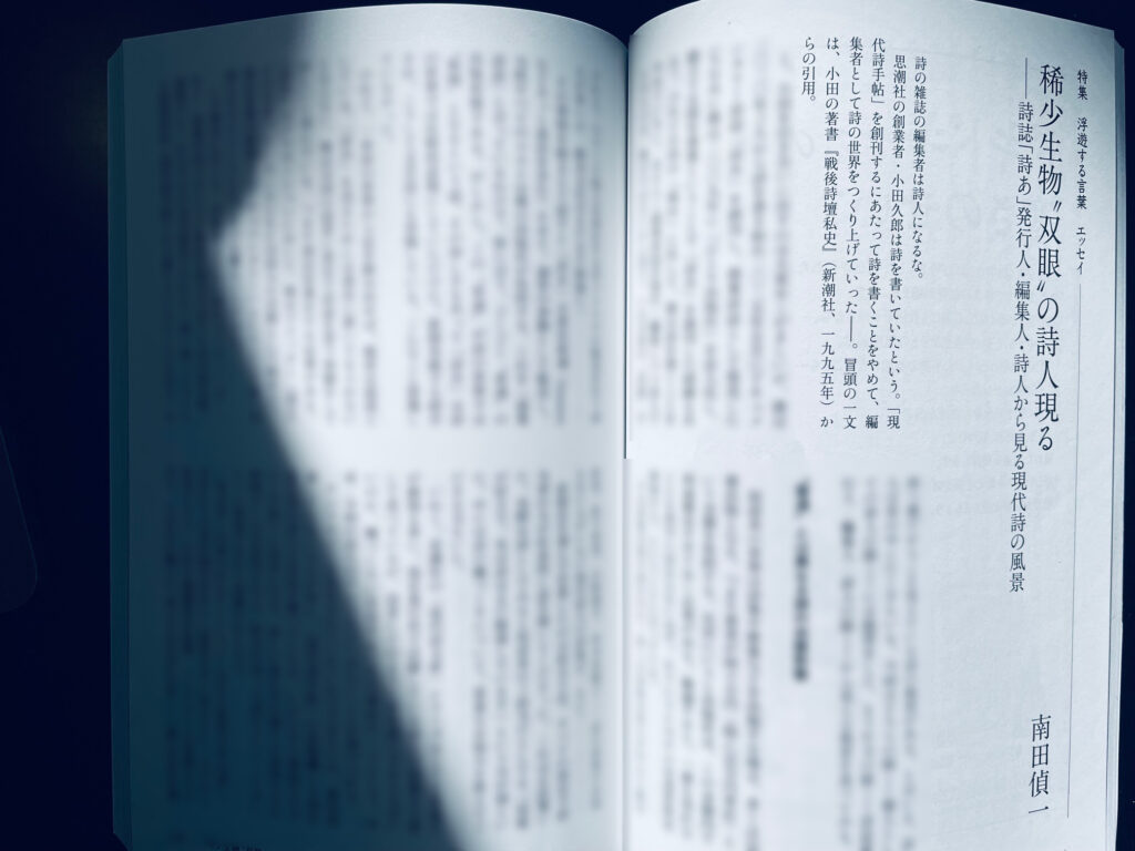 寄稿したのはエッセイ「稀少生物〝双眼〟の詩人現る 詩誌「詩あ」発行人・編集人・詩人から見る現代詩の風景」。2025年5月に「詩あ」を創刊し、書店営業などを行ったことで見えてきた現代詩の風景がありました。今回は詩人としてではなく、詩誌の発行人・編集人という〝単眼〟により、現代詩がおかれている課題などについて言及しました。